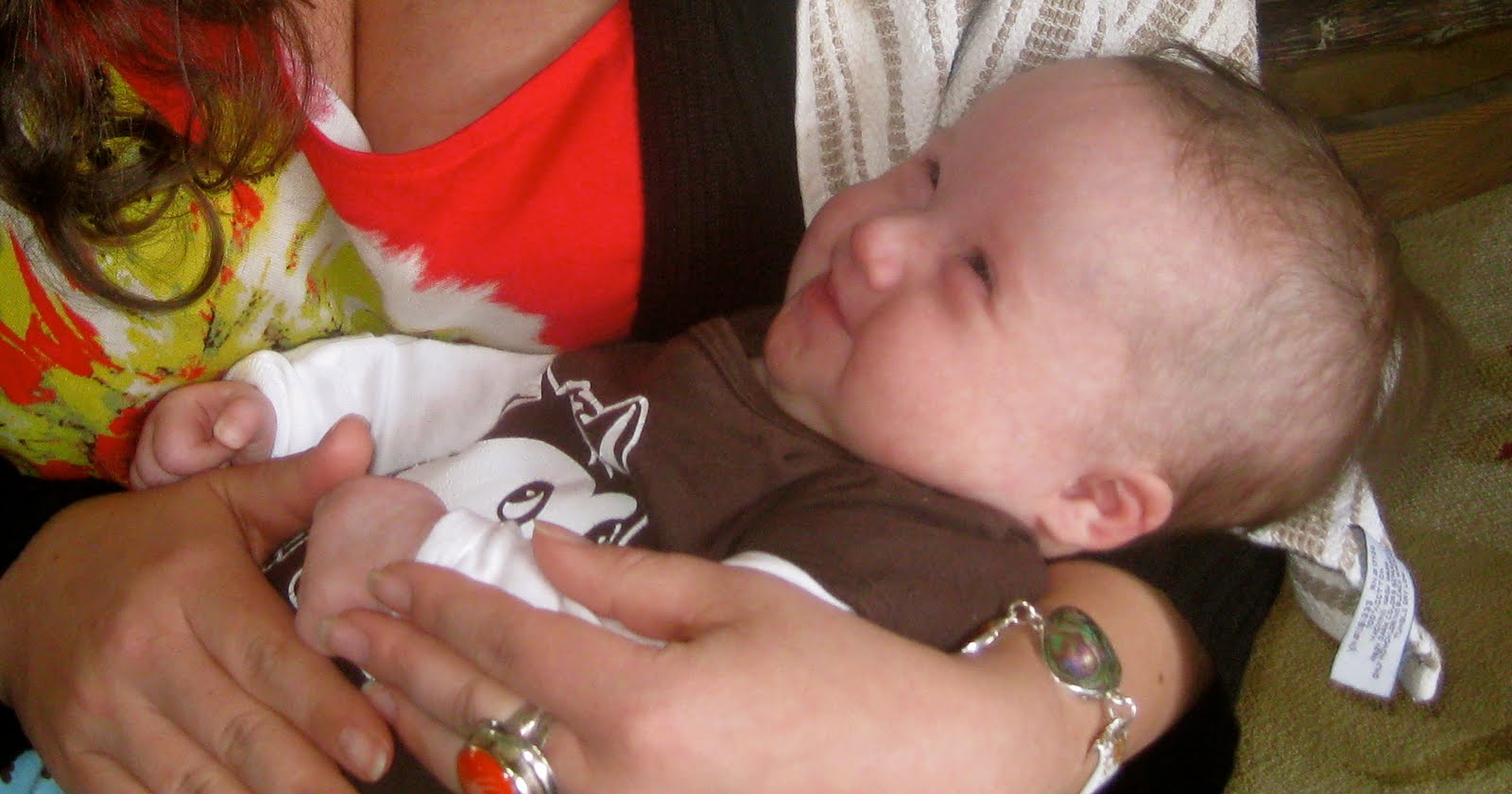 You scrumptious little ball of downy cheekiness, you leapt into my funny bone the other day when you laughed for the first time. It was just a syllable, just a hoarse, single chortle. A chort: "Henh." You were busy smiling away as I jiggled you and sampled the daily flavor of your cheeks (as I recall, it was pistachio), and I think the noise surprised and delighted us both equally. Your eyes got wide, like, what the heck just happened?, and I only succeeded in confusing your further with my own responsive bray.